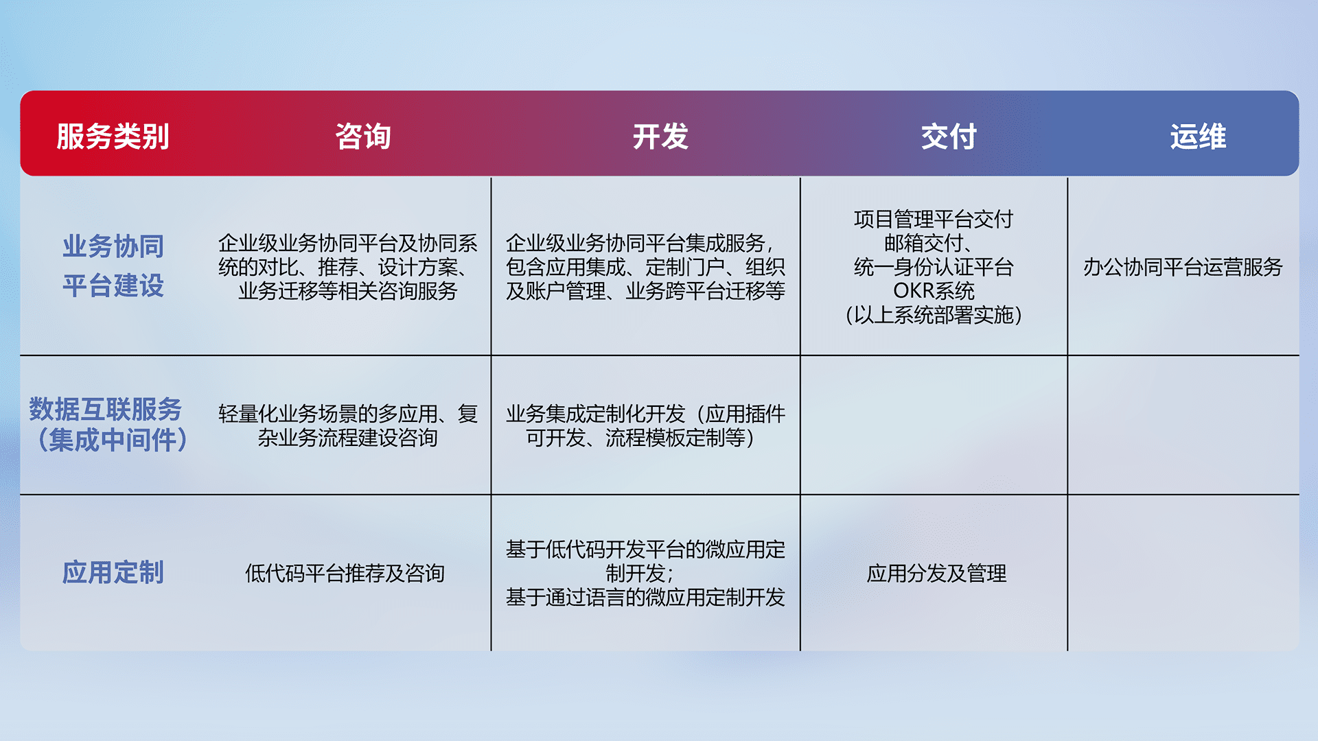 针对钉钉、、企微、、、IDaas等平台级产品提供产品的规划、、、、方案、、、、交付、、定制化开发等服务,,,,实现如统一协同办公、、智能客户服务、、混合会议管理、、、、智能数据查询、、、等业务场景,,,,实现数字化转型。。。。