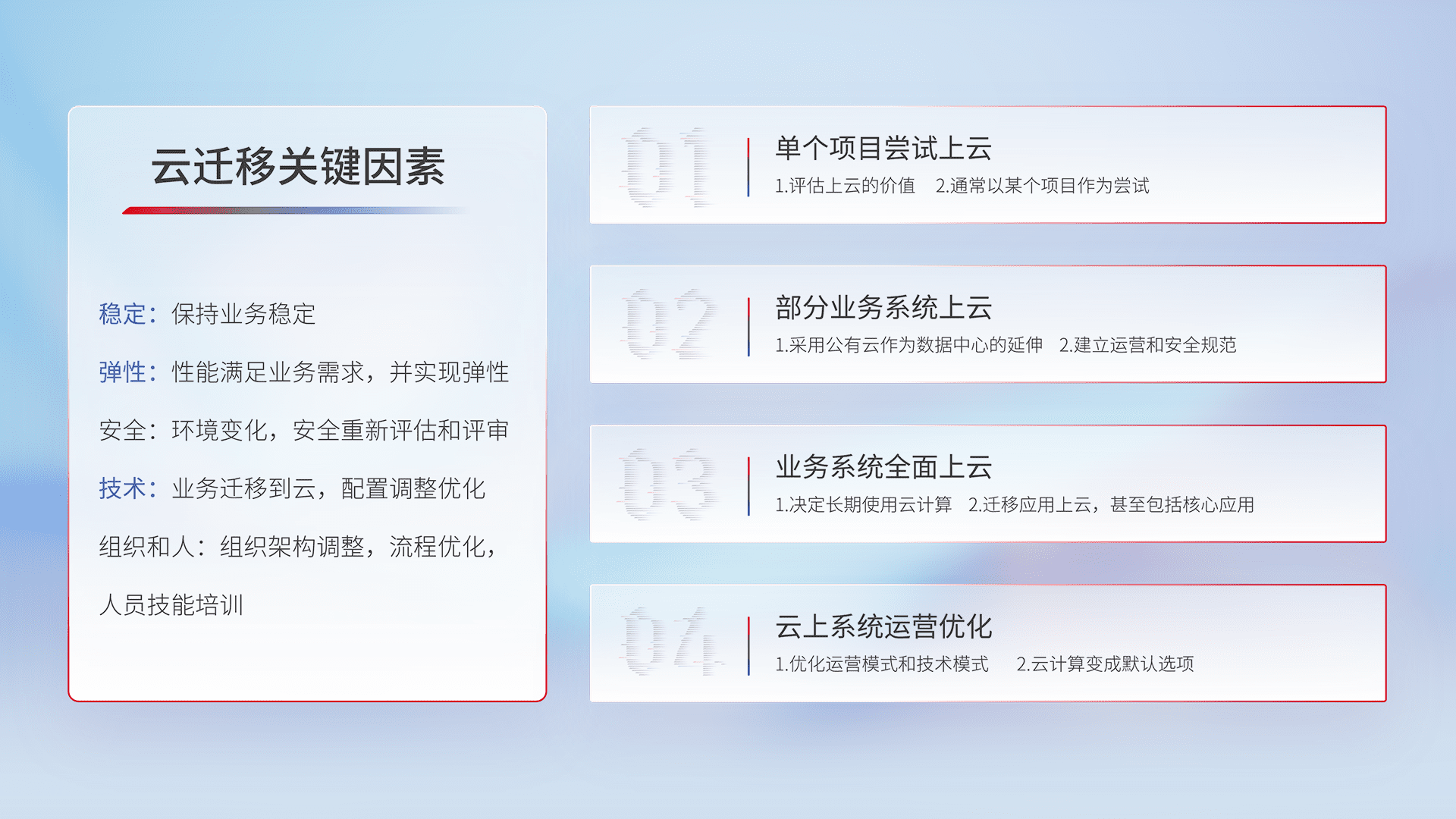 结合实际业务,,,从规划设计、、云平台选型、、、云原生改造、、、数据迁移、、、集成交付,,,,迁移全过程为客户识别最佳上云路径,,,,做好风险识别管理,,设计网络架构、、、、身份权限、、安全审计合规、、、操作审计、、、、日志审计、、、监控告警策略、、、、多站点容灾设计等,,,,对云上基础设施进行整体规划,,提升IT治理水平,,,以满足弹性、、、高可用、、、、高性能的需求。。