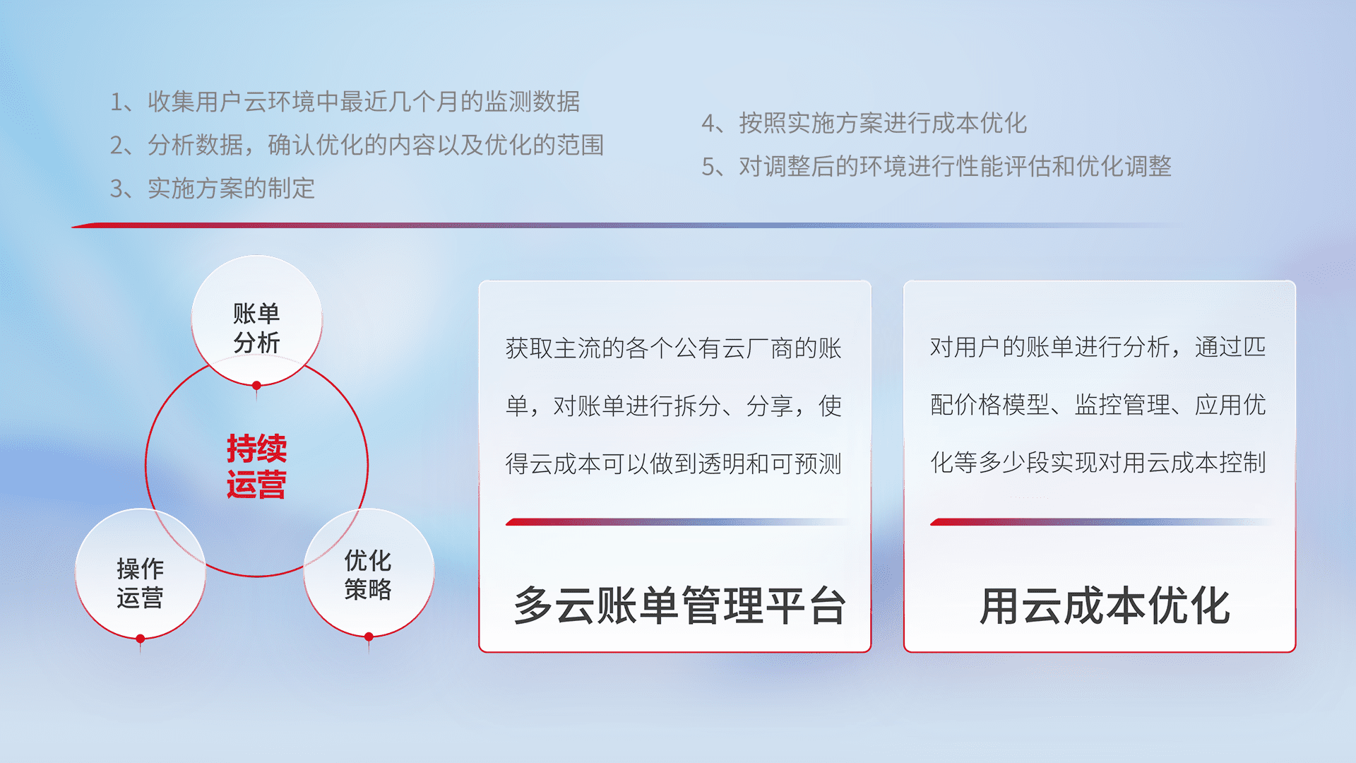 通过多云纳管,,,,以统一的资源数据模型把客户的云资源进行抽象和封装,,进而实现对多云资源的统一操作,,,保障云资源管理的可靠性、、稳定性与可用性。。。。量身定制化运维内容,,配置、、、开发运维、、补丁管理、、备份、、、、监控、、认证和访问管理、、、、审计和日常巡检等,,,保障在用云过程中的可靠度,,,,稳定度以及高可用率。。。